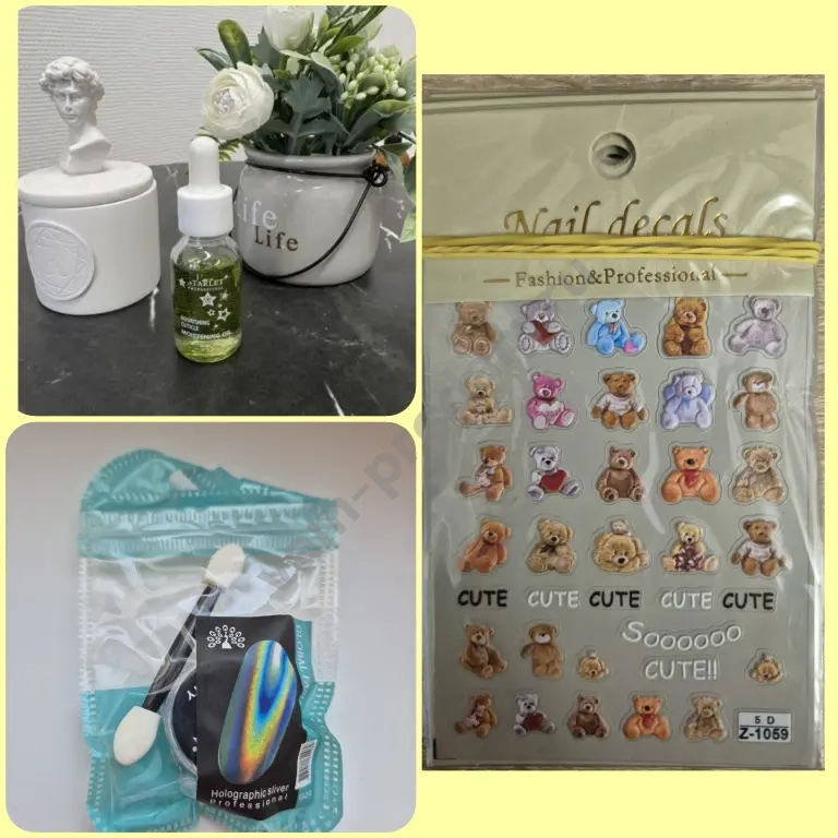 чёрный,белый),масло для кутикулы, дизайн для ногтей (краски,сухие блестки,жидкие блёстки, наклейки).