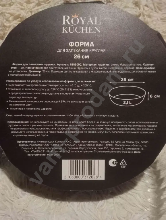 Форма для запекания Royal kuchen,круглая стеклянная,новая