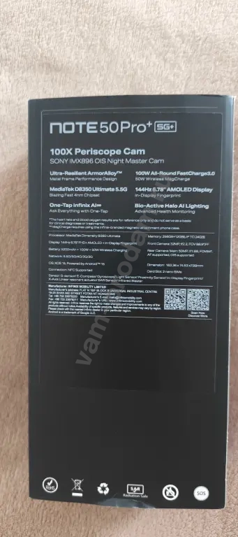 Комплект поставки включает в себя быструю зарядку на 100 Вт и беспроводную на 30 Вт, NOTE 50 Pro+ 5G+ при этом поддерживает мощность зарядки по воздуху до 50 Вт. Основная камера смартфона – объектив Sony IMX896 с оптической стабилизацией и апертурой f/1.88. Ее дополняет перископ на 50 Мп с оптической стабилизацией, трехкратным оптическим и шестикратным цифровым зумом без потери качества. Третий модуль - 8 Мп 112° ультраширокоугольная камера.
