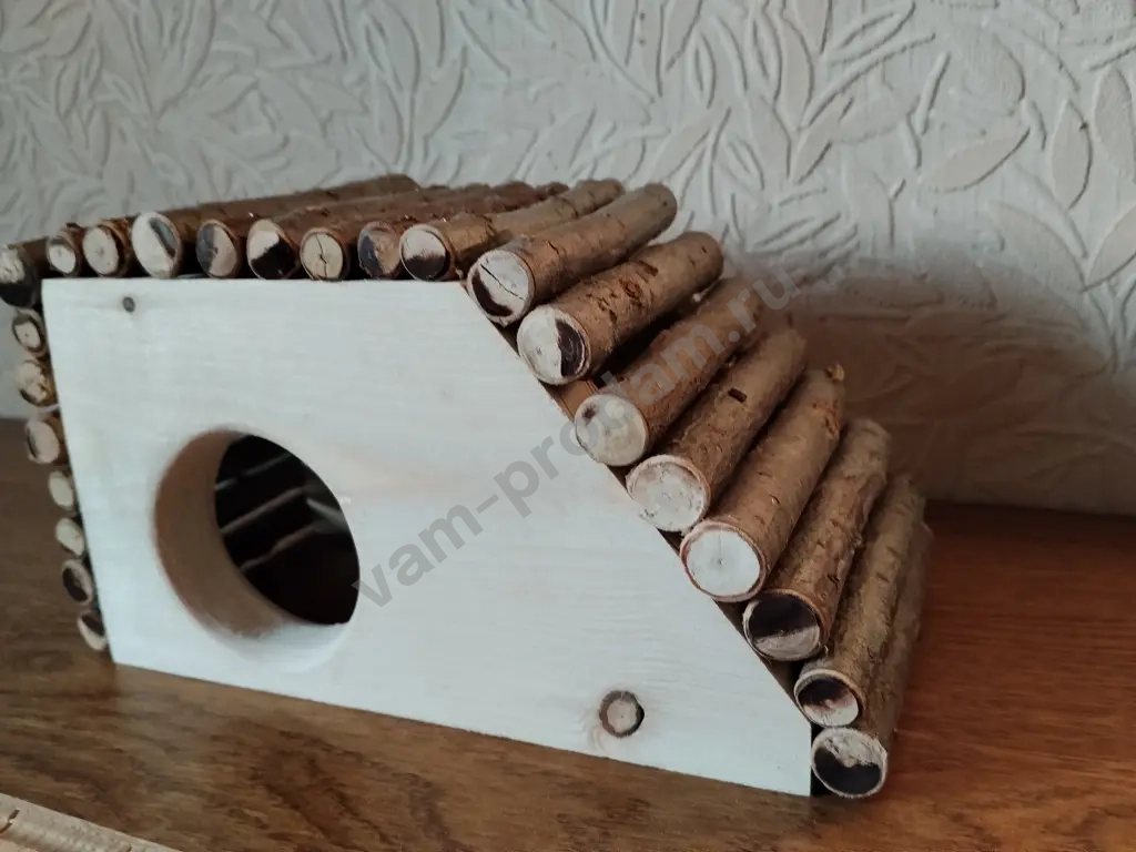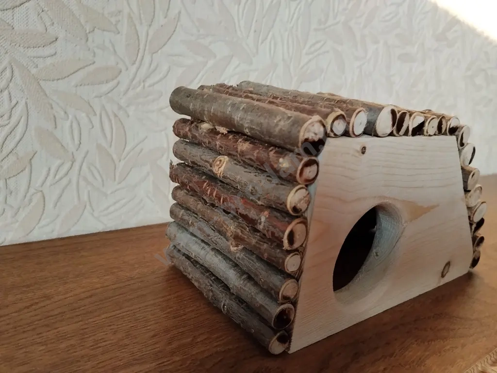 домик изготовлен из дерева. размер длина 20см, ширина 10см, высота 10см, вход 5см.Можно из готовить большего размера