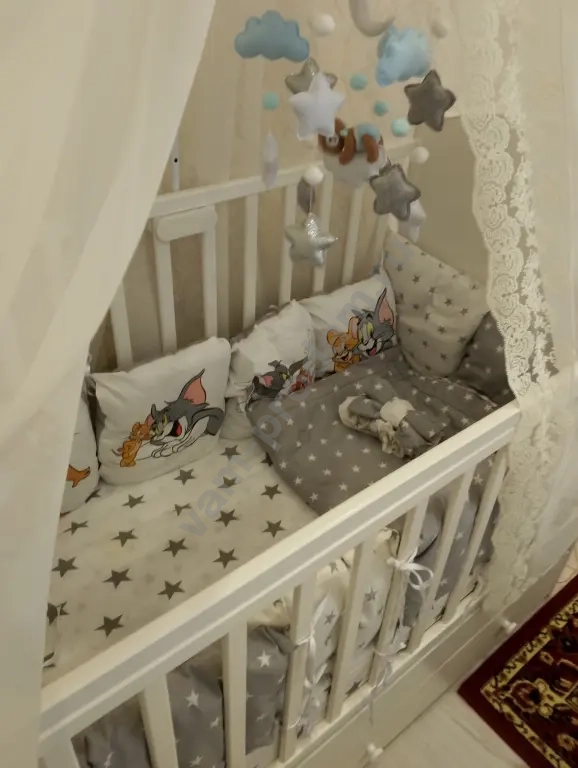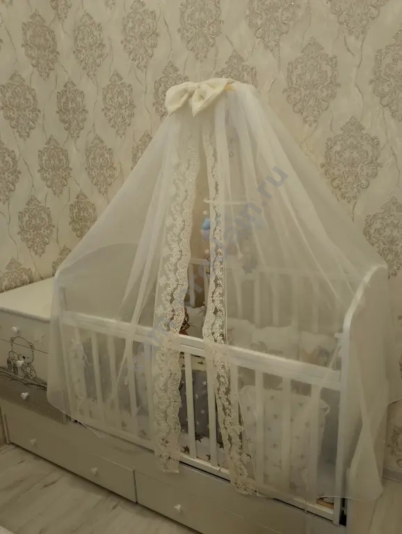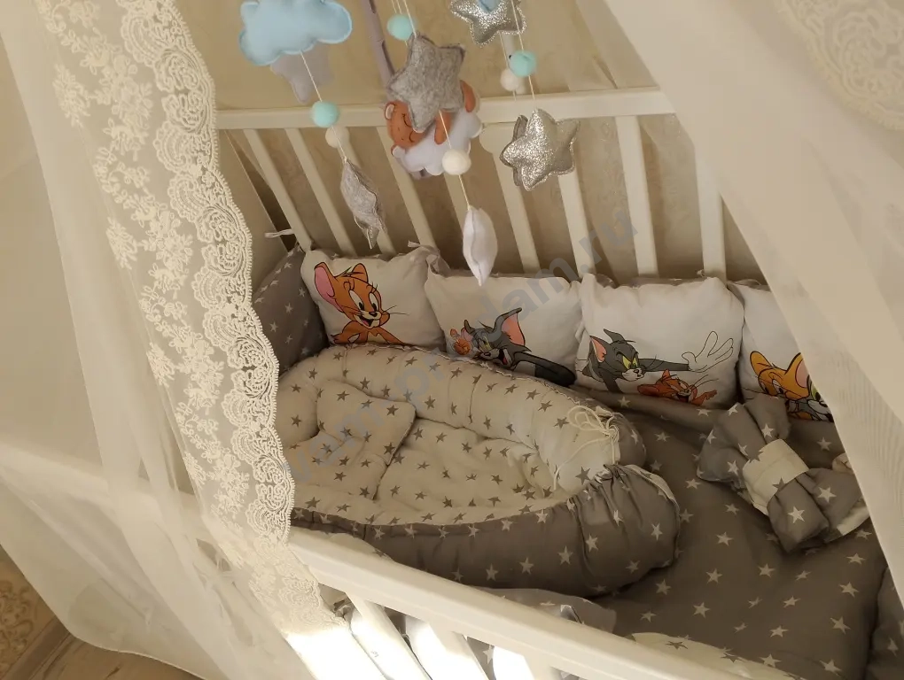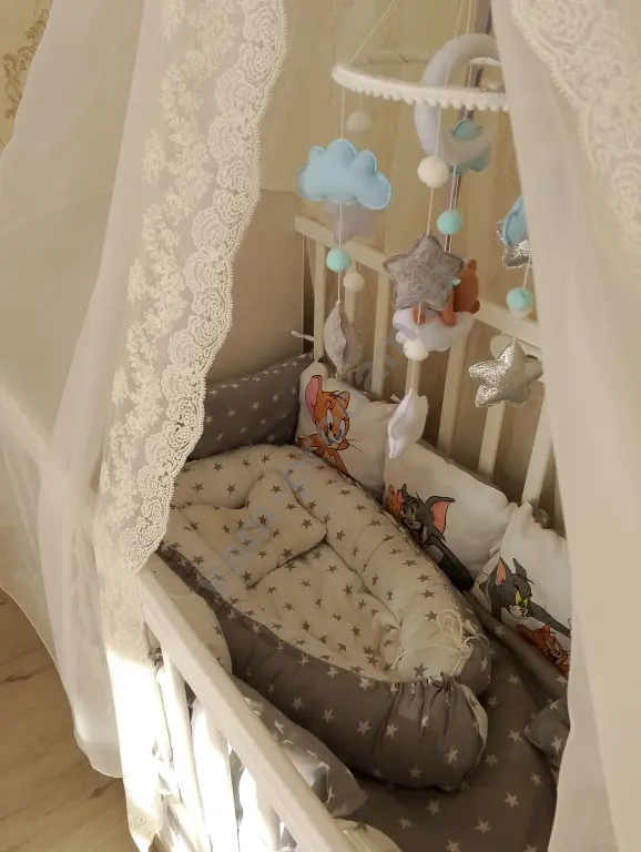 В комплекте идет новый качественный матрас с непромокаемым наматрасником и мягкие бортики-подушечки по всему периметру. Также отдаем уютный кокон для новорожденного и теплое детское одеяло.