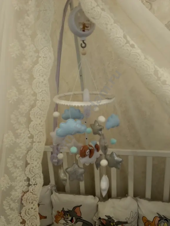 Отдельный бонус — красивый балдахин со специальной стойкой-держателем и музыкальный мобиль. Мобиль со своей стойкой, он крутится, светится и играет приятные мелодии, отлично завлекая малыша. Вам не придется ничего докупать отдельно, это готовое решение «под ключ» для детской комнаты.