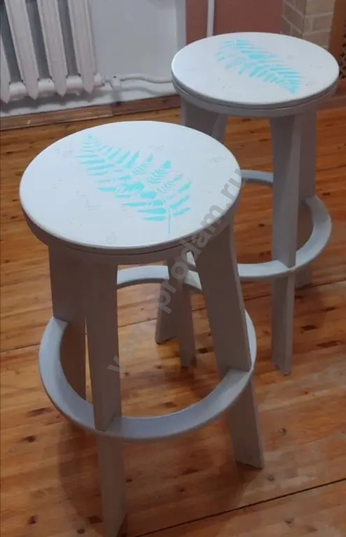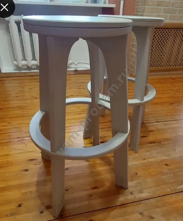 Два барных стула, уже в сборе. Материал - березовая фанера. Изначально не окрашен, только отшлифован. Потом покрыт светло-серой акриловой каской и матовым акриловым лаком. Не пахнет. На ножках наклеены войлочные накладки, чтобы не царапать пол и не издавать шум при передвижении. Высота стула 75см, высота подножки 35см, диаметр сидения 35см. Рассчитан на вес до 150кг.
