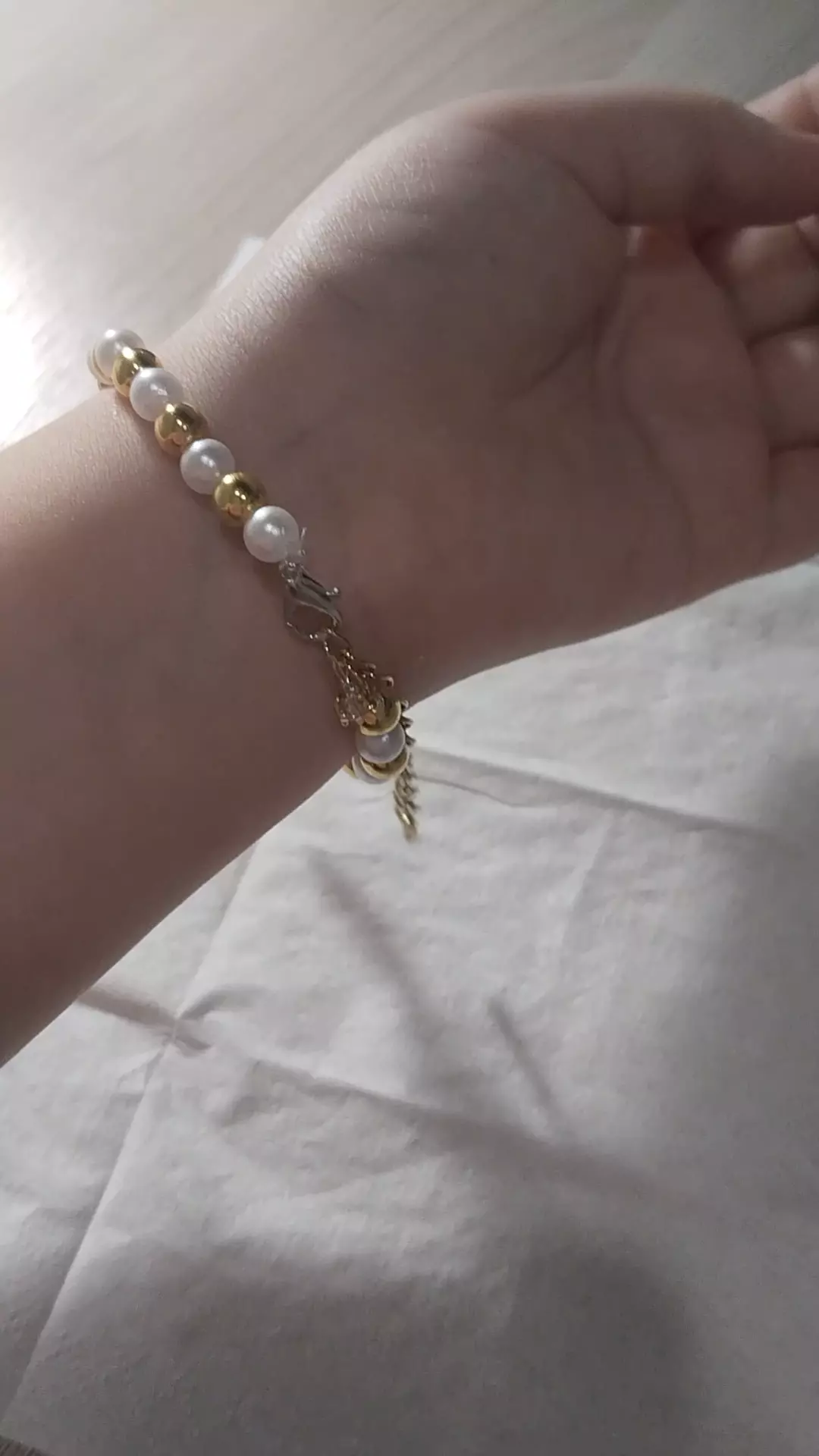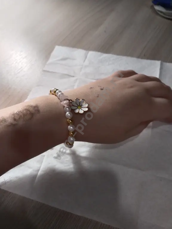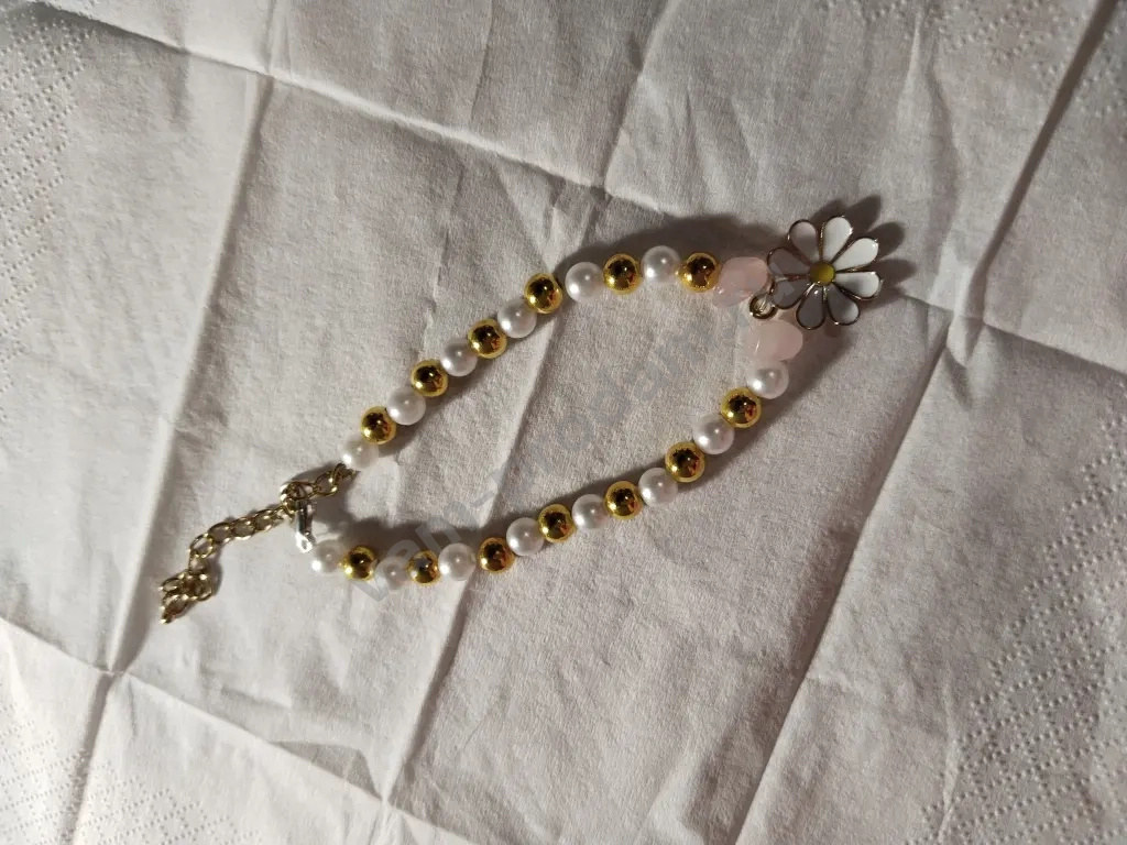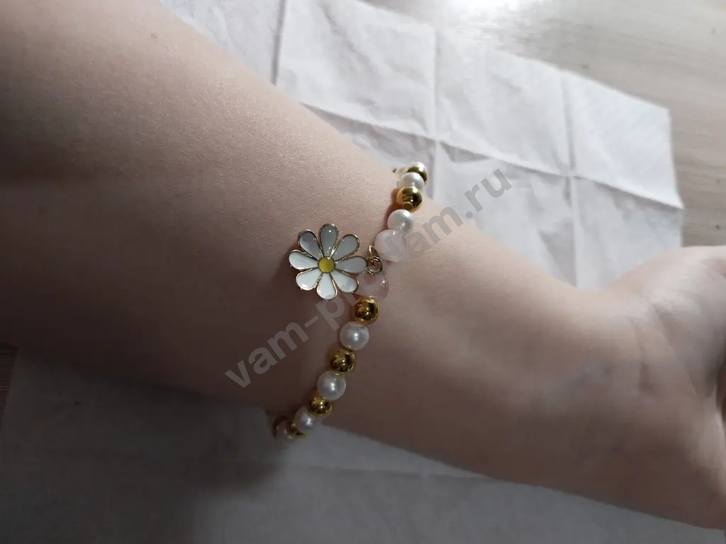 красивый браслет идеально будет для девочки и женщины он состоит из золотых и белых жемчужин браслете есть два камня нежно-розового цвета между ними расположена ромашка размер можно корректировать