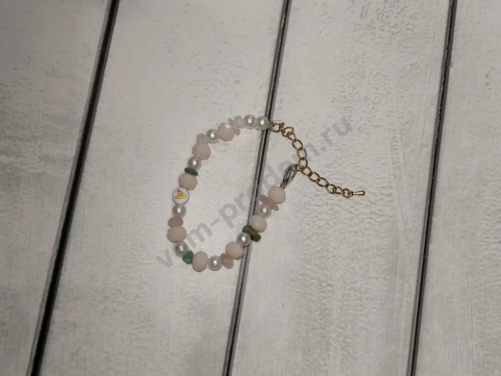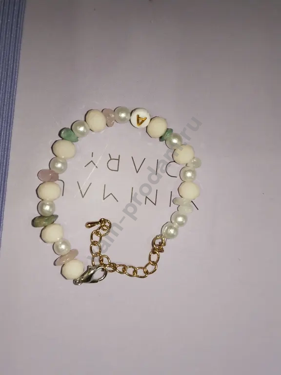 браслет выполнен в нежных цветах в нём есть камни разных цветов также есть бусинка с буквой ,,А"ещё есть фигурные бусины они цветом топлёного молока застёжку можно регулировать