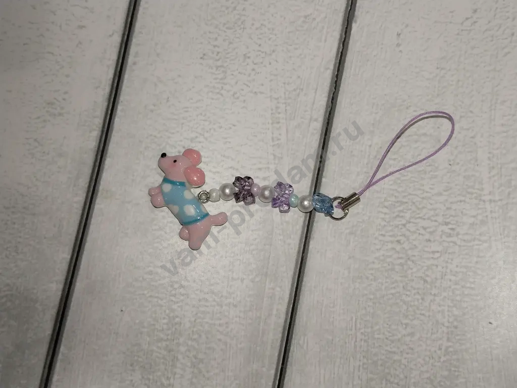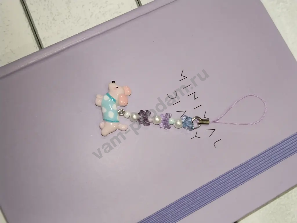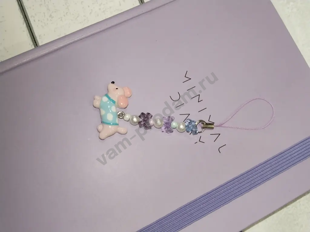 подвеска на телефон выполнено в нежных цветах: нежно-голубой, нежно розовый и белый. также снизу есть собачка она тоже выполнена в нежных цветах