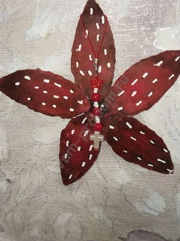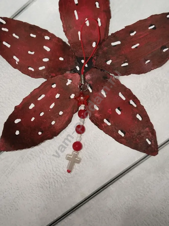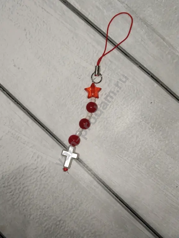 подвеска на телефон выполнена в красном цвете в ней есть жемчуг белый бисер красная звёздочка и белый крест на конце подвески