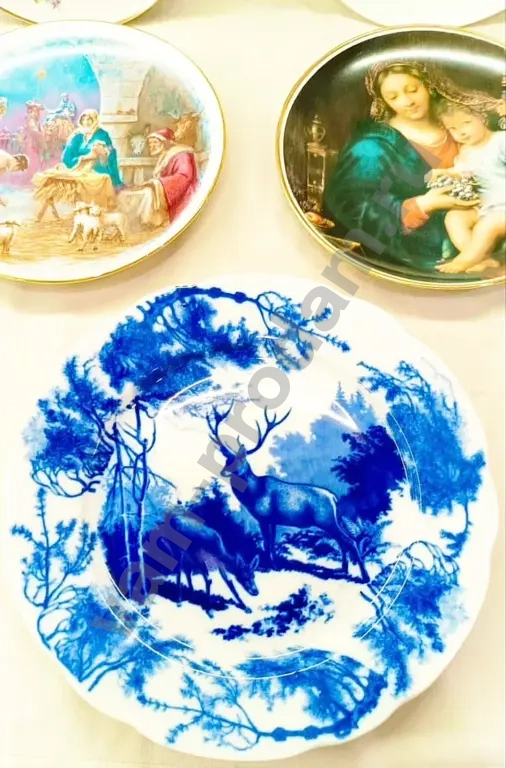 5.Тарелка декоративная настенная "Олени в лесу", фарфор, кобальт. Дулево, СССР, 1980-е. Отличное состояние, витринное хранение. Диаметр - 24 см. Стоимость - 2300 руб.