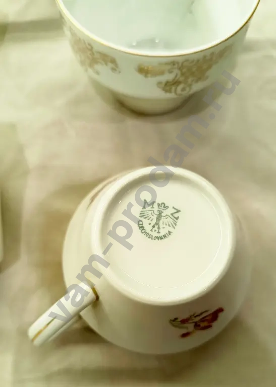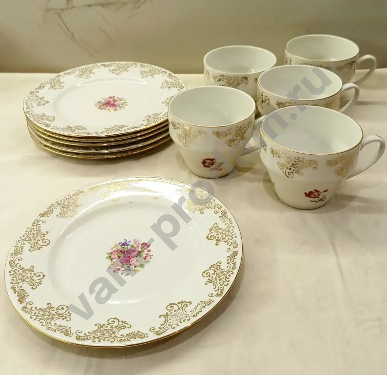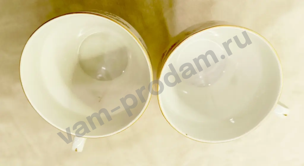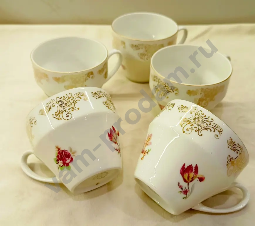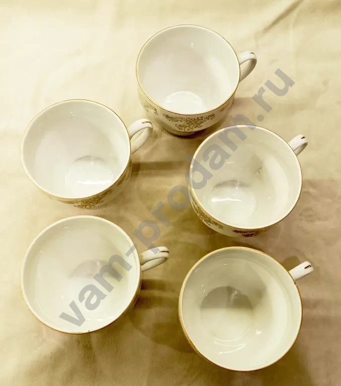 Набор чайных чашек 5 шт., со следами длительного бытования, имеются потертости позолоты и есть небольшие внутренние трещины на 2 чашках - 500 руб.