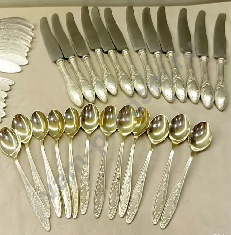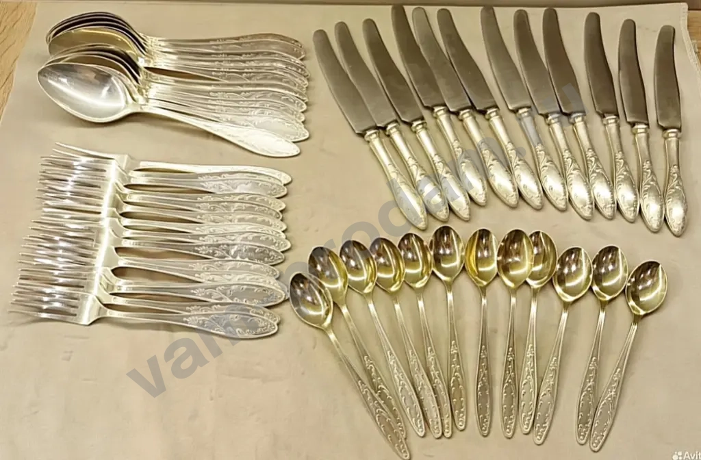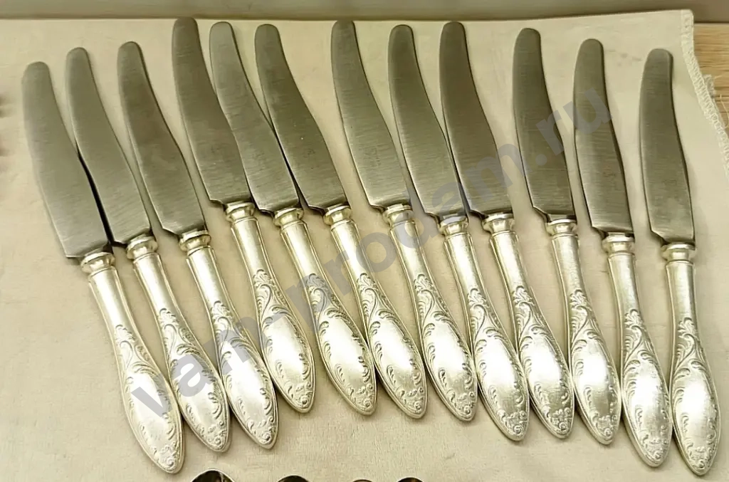 Набор столовых приборов на 12 персон, мельхиор СССР. В отличном состоянии. Нож - 21 см, столовая ложка - 20 см, вилка - 18 см, чайная ложка - 14 см. Стоимость набора - 10000 руб.