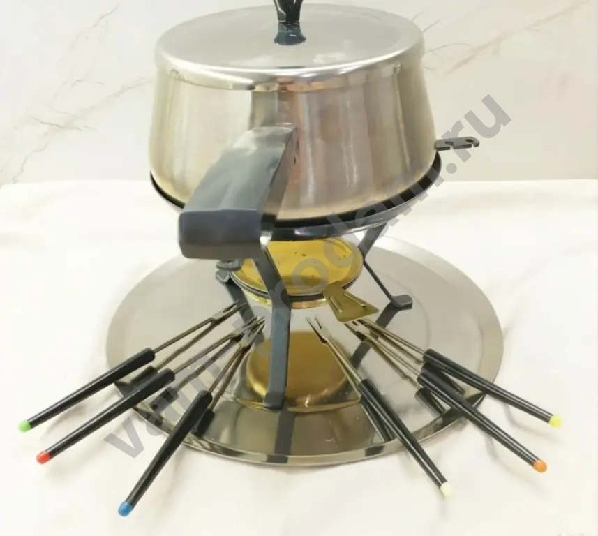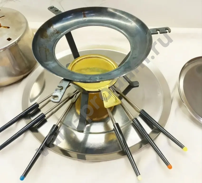 В комплекте: сосуд с ручкой, крышка верхняя, крышка сосуда, 6 вилок с цветной маркировкой, нагревательный блок с ручным терморегулятором, шнур со штепсельной вилкой и двухполюсным разъёмом, подставка, поддон, упаковка сухого горючего, картонная коробка.